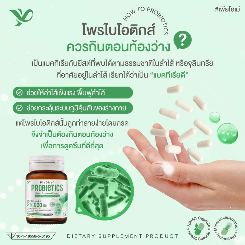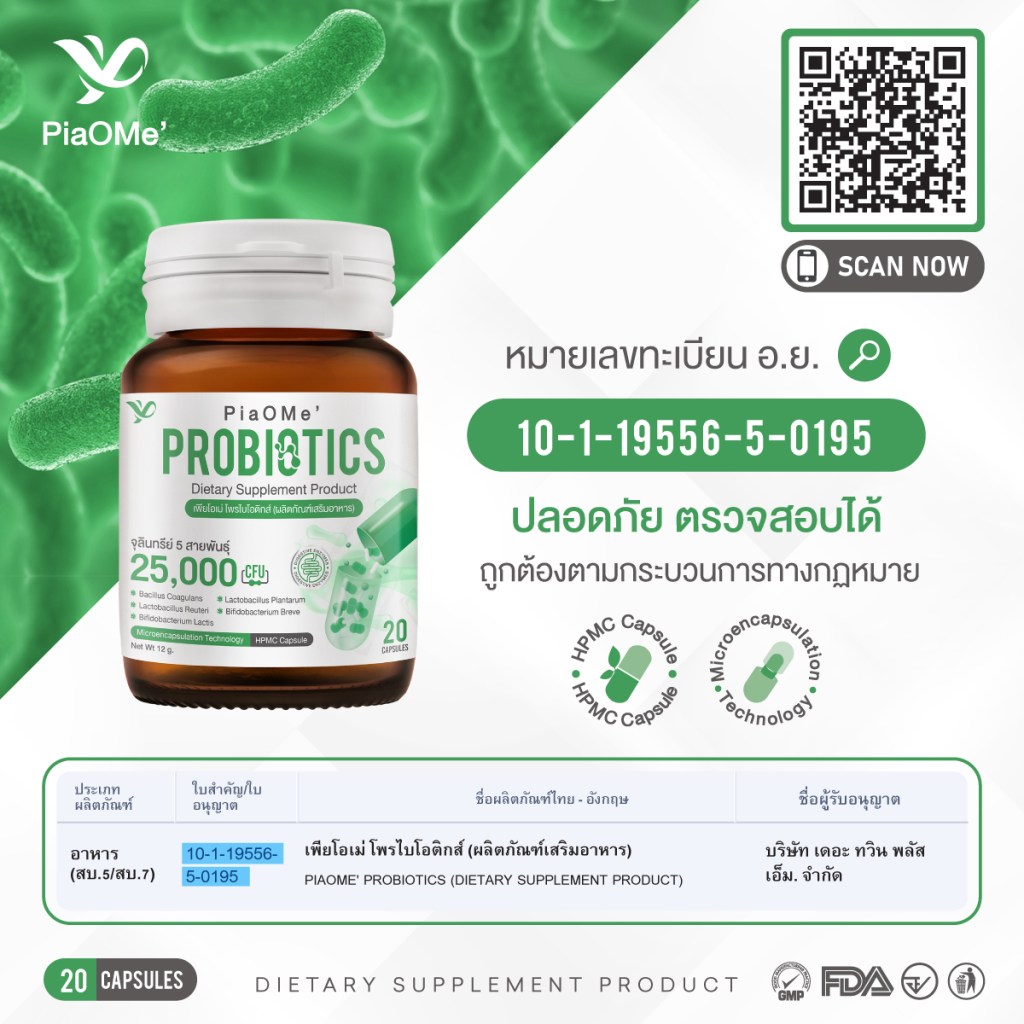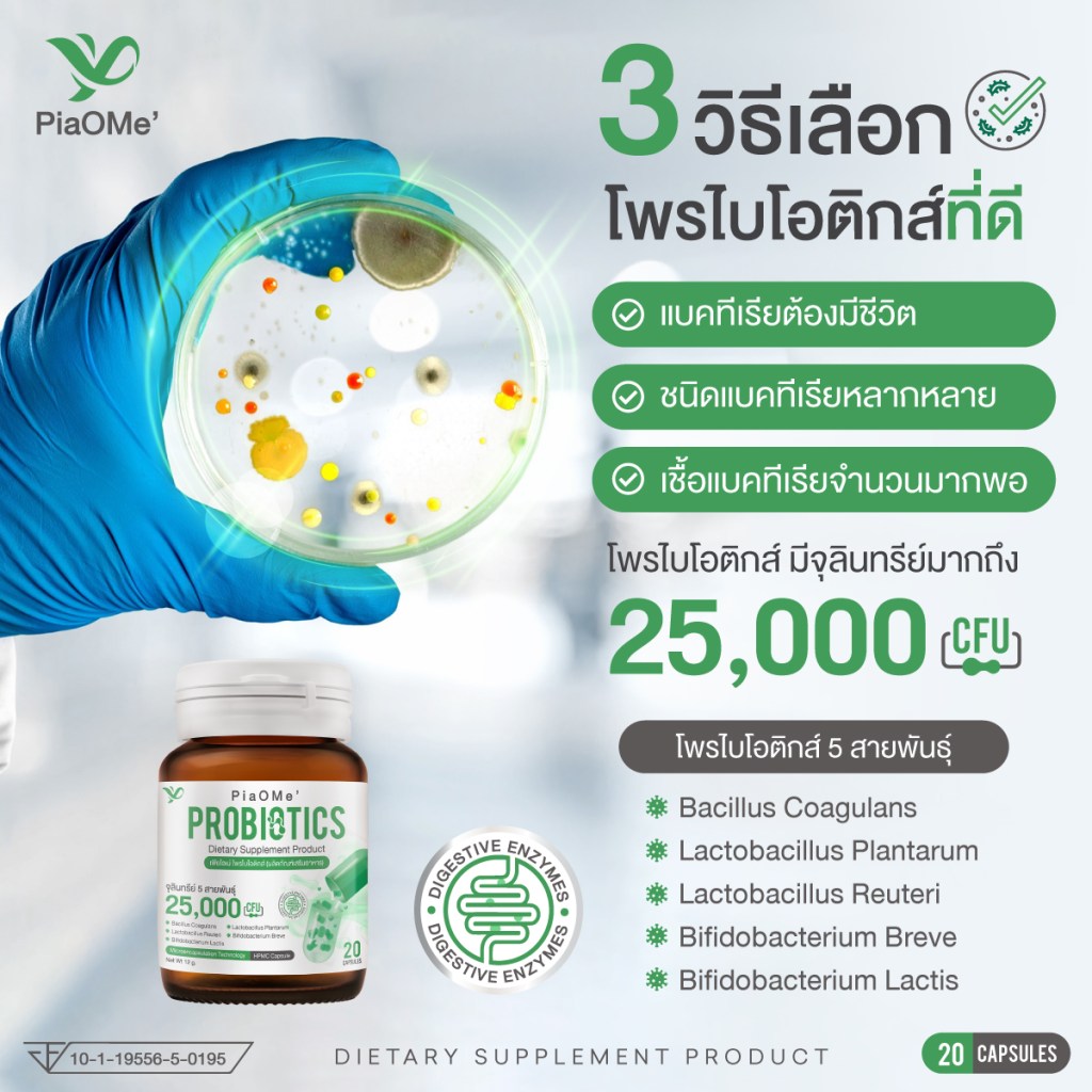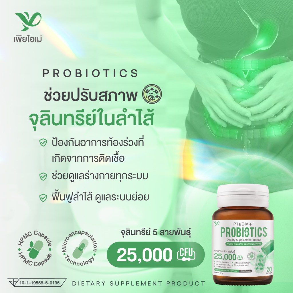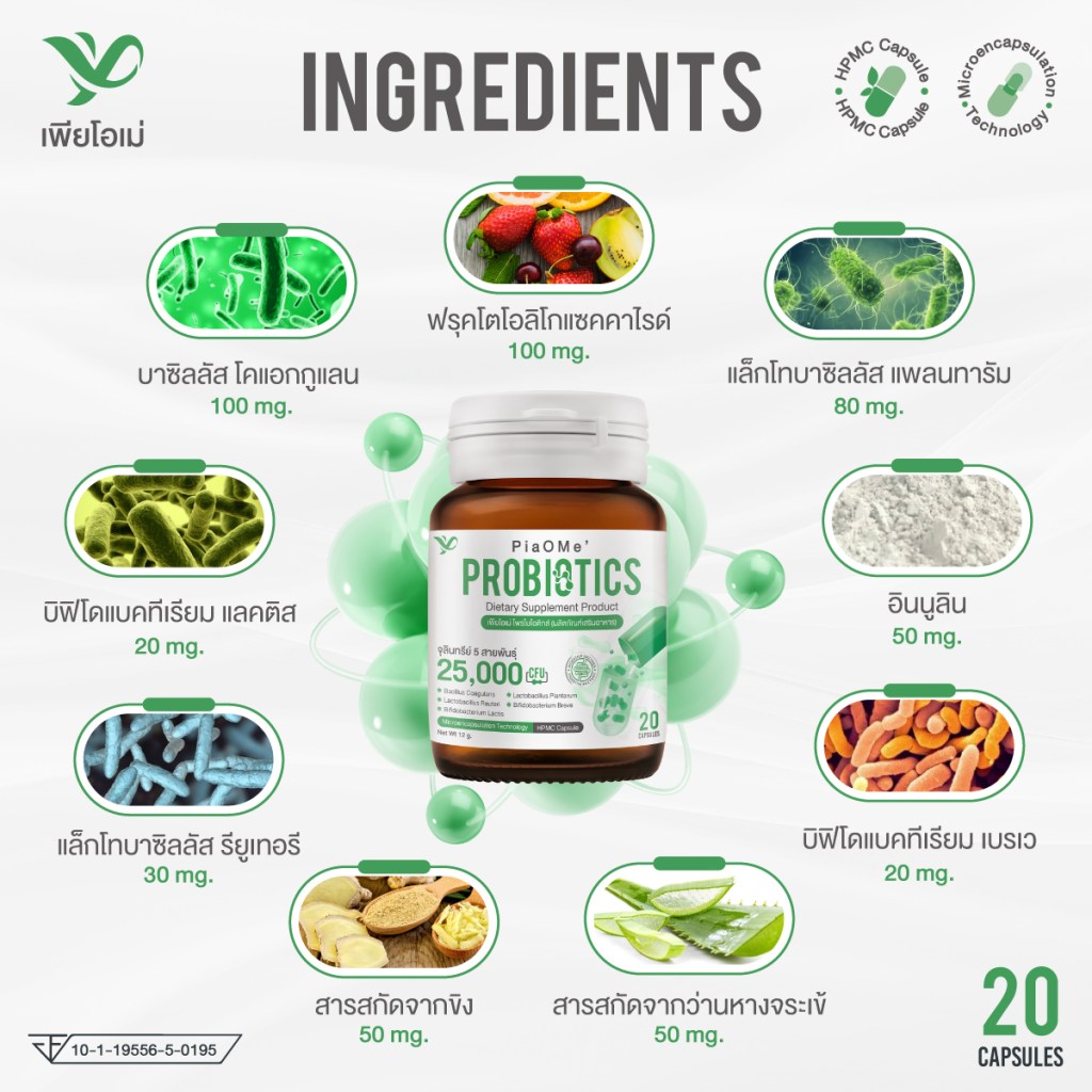 PiaOMe’ โพรไบโอติกส์ มีจุลินทรีย์ 5 สายพันธุ์ จำนวนมากถึง 25,000 CFU มีพรีไบโอติกส์ อาหารเลี้ยงเชื้อจุลินทรีย์ ทำให้จุลินทร์ถูกดูดซึมที่ลำไส้ใหญ่ ใช้เทคโนโลยี Microencapsulelation เพื่อป้องกันไม่ให้จุลินทรีย์ถูกน้ำย่อยทำลายในกระเพาะอาหาร